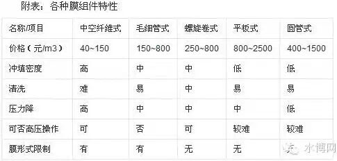 板框式(Plate and Frame Module)、螺旋卷式(Spiral Wound Module)、圆管式(Tubular Module)、中空纤维式(Hollow Fiber Module)和毛细管式(Capillary Module)。前两种使用平板膜,后三者使用管式膜。圆管式膜直径>10mm;毛细管式0.5~10.0mm;中空纤维式<0.5mm。